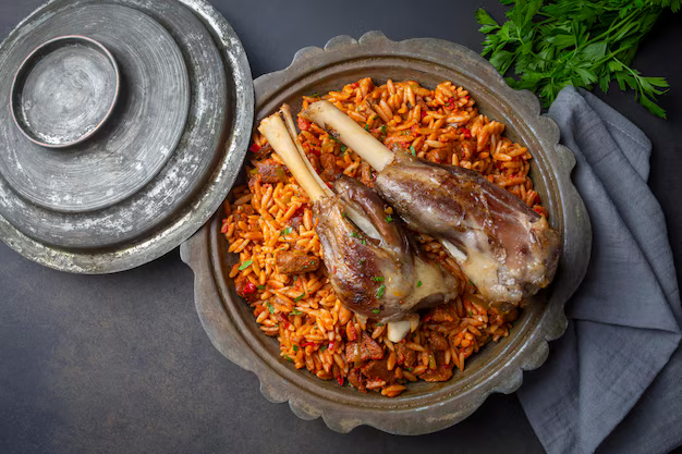 A beautifully braised lamb shank, slow-cooked to perfection in a fragrant medley of Turkish spices, served with a side of saffron-scented rice and roasted vegetables.